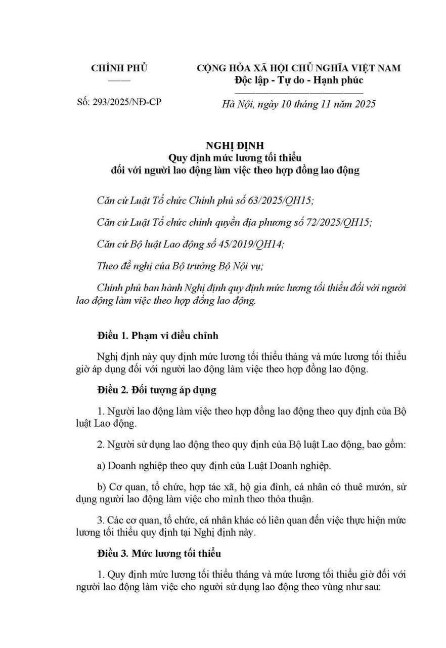 Ngày 10/11/2025, Phó Thủ tướng thay mặt Chính phủ ban hành Nghị định 293/2025/NĐ-CP quy định mức lương tối thiểu đối với người lao động làm việc theo hợp đồng lao động – Quy định mức lương tối thiểu vùng năm 2026.