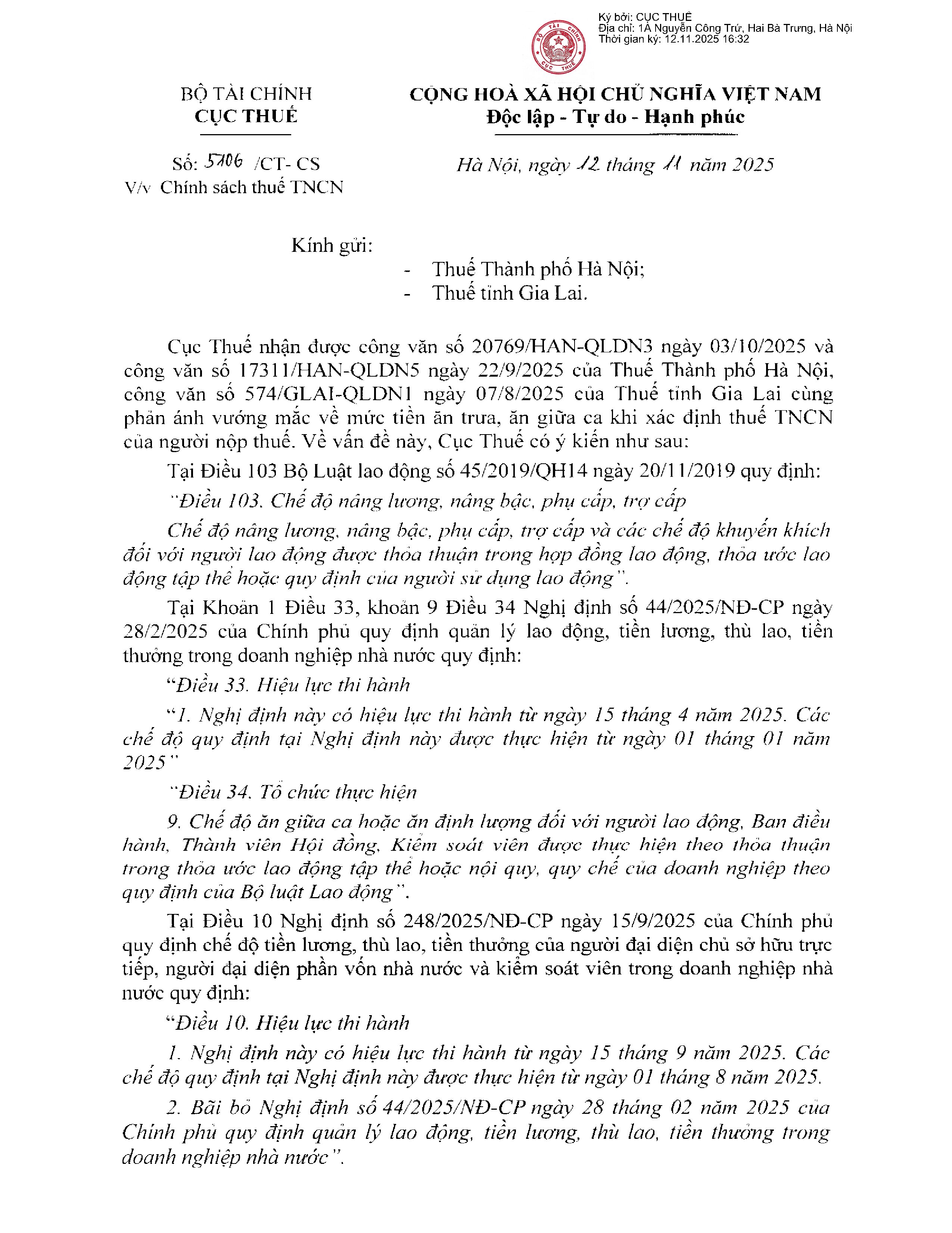 Đồng thời, tham khảo nội dung hướng dẫn tại Công văn 5106/CT-CS năm 2025 Cục Thuế đã có nội dung hướng dẫn về xác định thuế TNCN đối với tiền ăn giữa ca của người lao động.