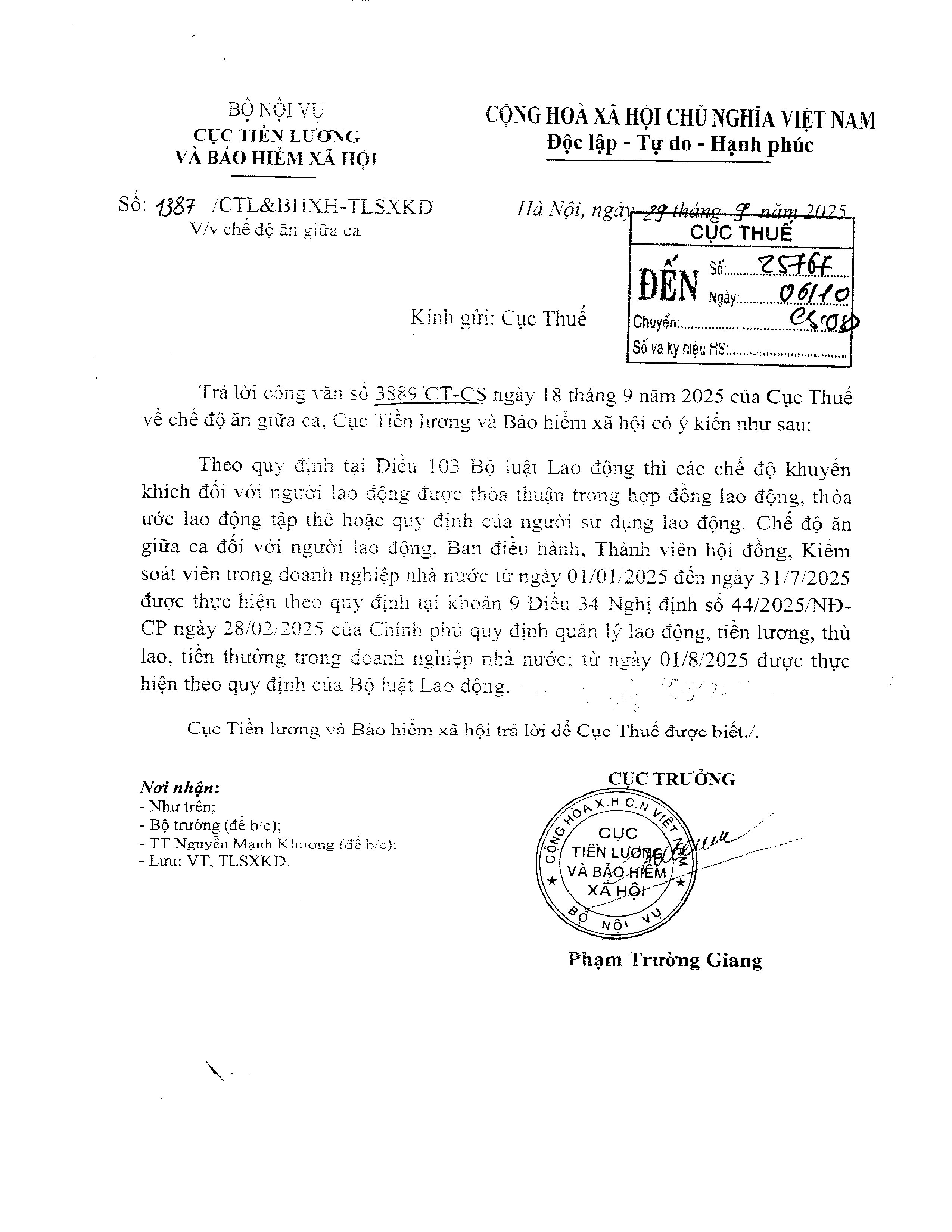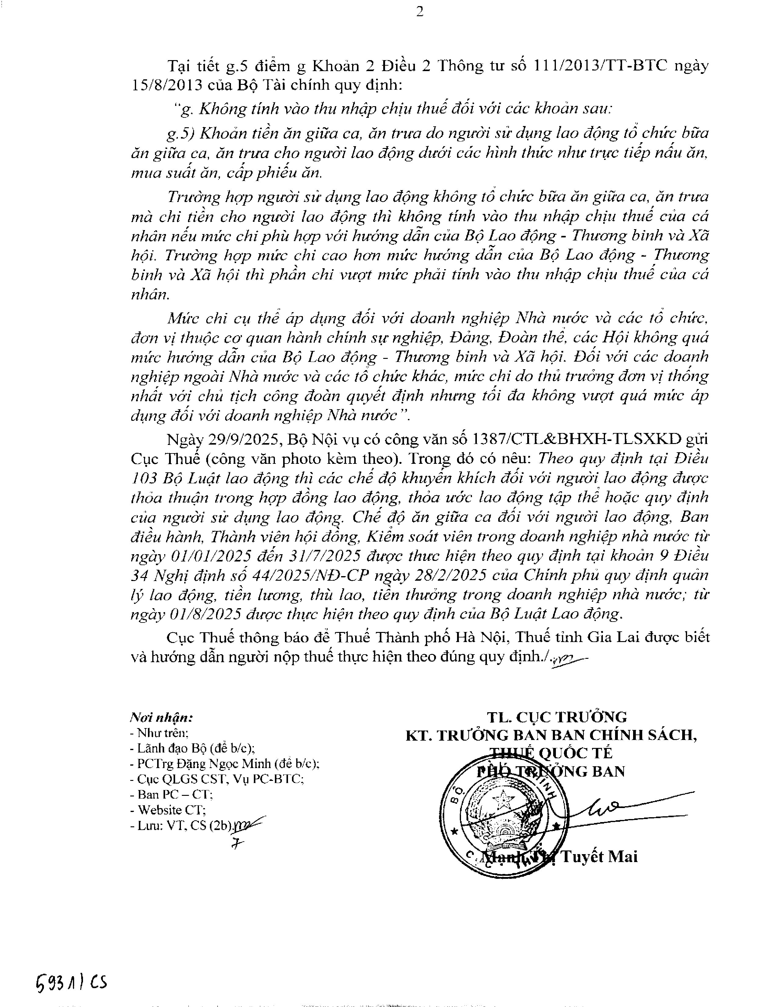 Mặt khác, Bộ Nội vụ cũng đã có Công văn 1387/CTL&BHXH-TLSXKD năm 2025 gửi Cục Thuế hướng dẫn xác định thuế TNCN đối với tiền ăn giữa ca của người lao động. Trong đó có nêu rõ: