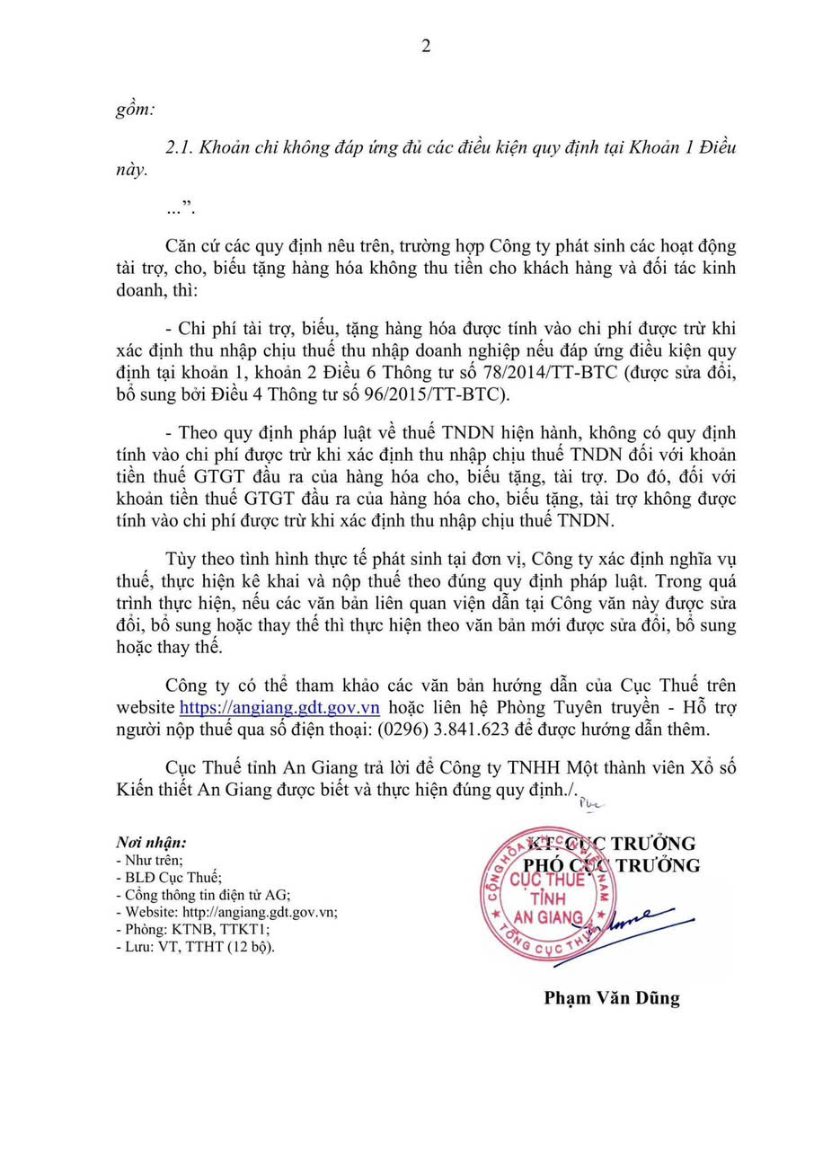 Thuế GTGT đầu ra của hàng biếu tặng không được trừ khi tính thuế TNDN – Tham khảo tại Công văn số 689/CTAGI-TTHT về việc chi phí được trừ khi xác định thu nhập chịu thuế TNDN của hàng cho biếu tặng tài trợ: